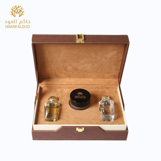 صندوق إهداء مكسى بالجلد - يستوعب عطرين مع معطر شعر و معطر جسم