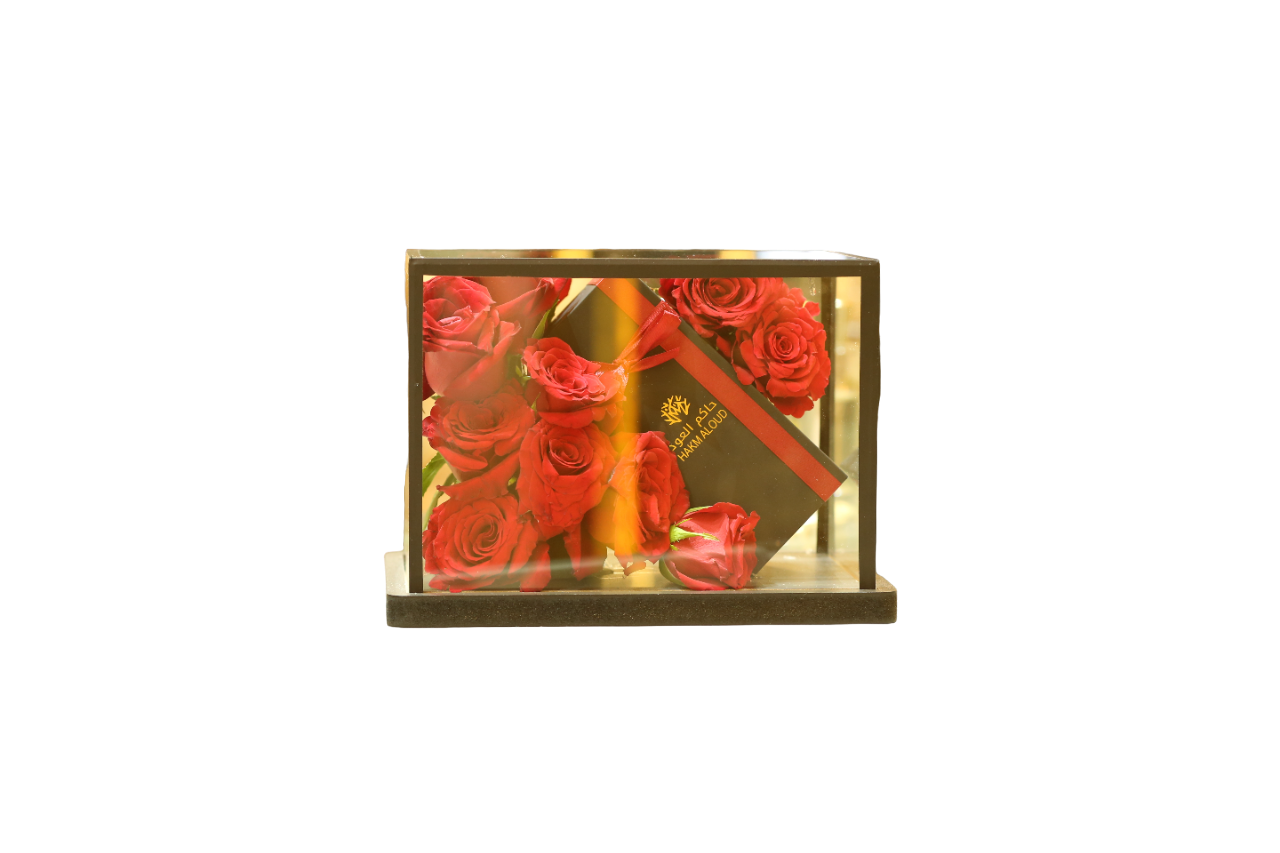 هدية قيمة عبارة عن صندوق فاخر فيه عدد من الورد مع عطر فاخر من حاكم العود